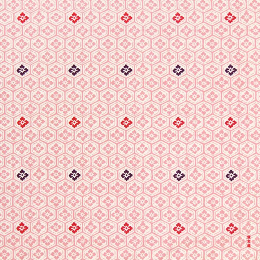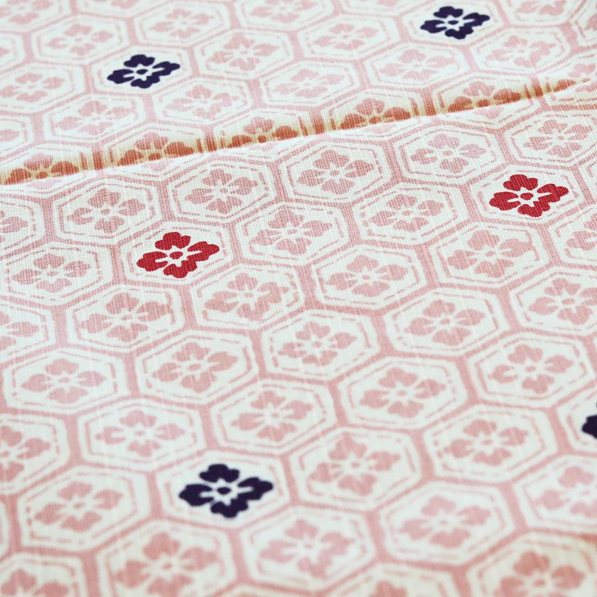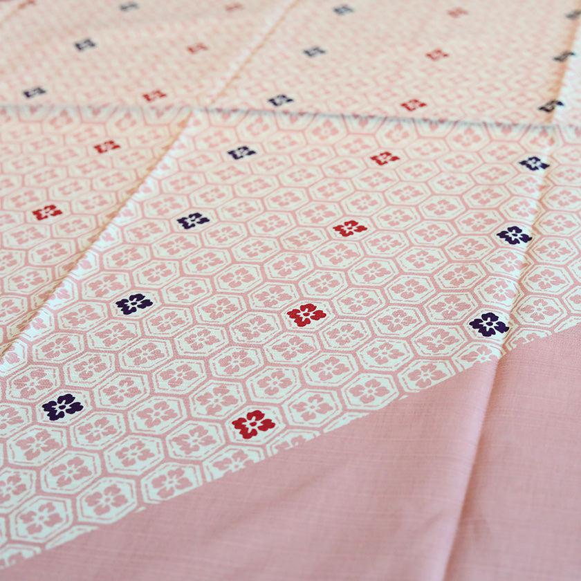 「亀甲に花菱」は長寿を願う柄で、伝統的な美しさが魅力。四角のうち2箇所がピンクと赤で彩られていて、結ぶとそのカラーリングが美しく映えるのも魅力です。