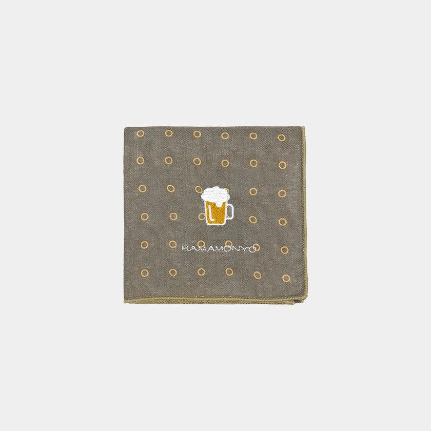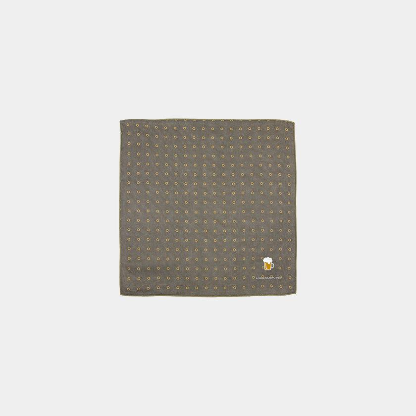 泡のようなドット柄にワンポイントでビールジョッキが刺繍された横浜捺染のカジュアルなハンカチです。