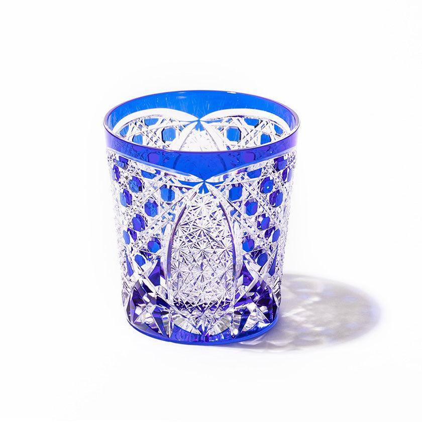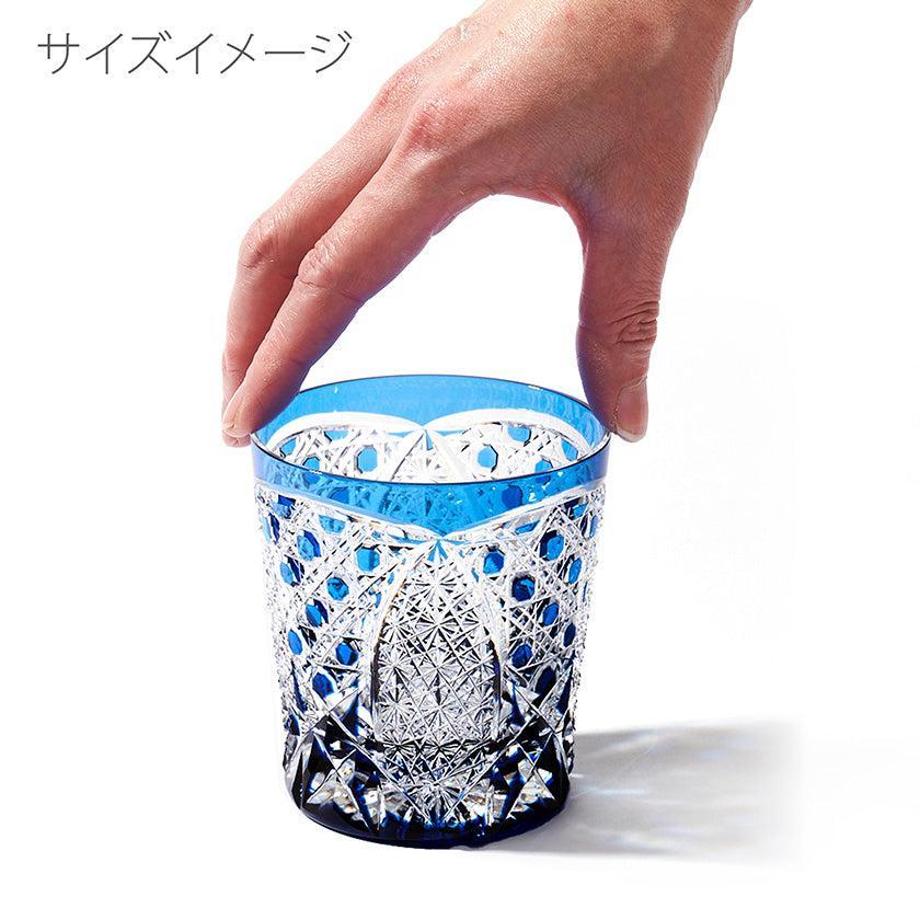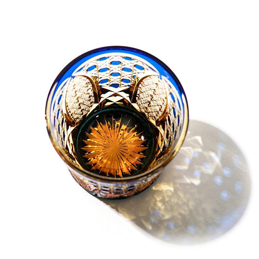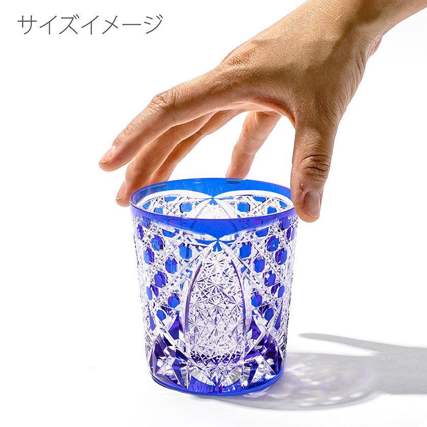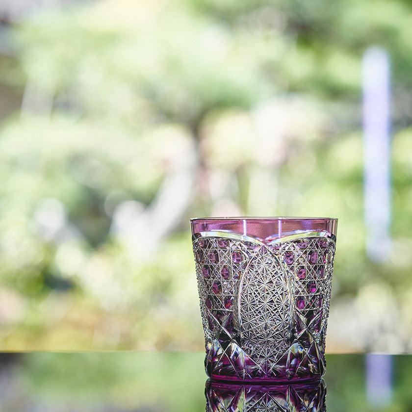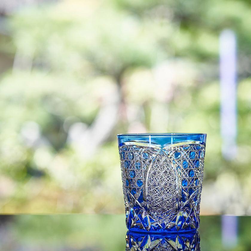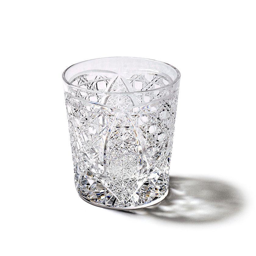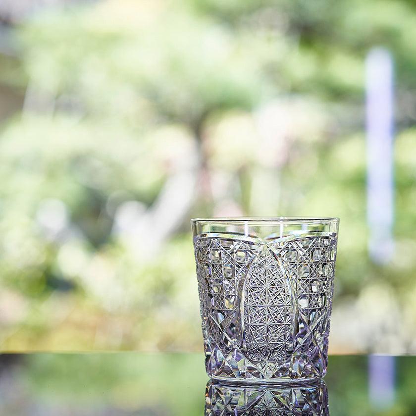 籠の目を図案化し、古来より魔除けとされた「籠目紋」、 不老長寿を表す菊花が連なり咲き誇る様を表す「菊繋ぎ紋」。 二種類の紋様を交互に配した縁起の良い江戸切子です。