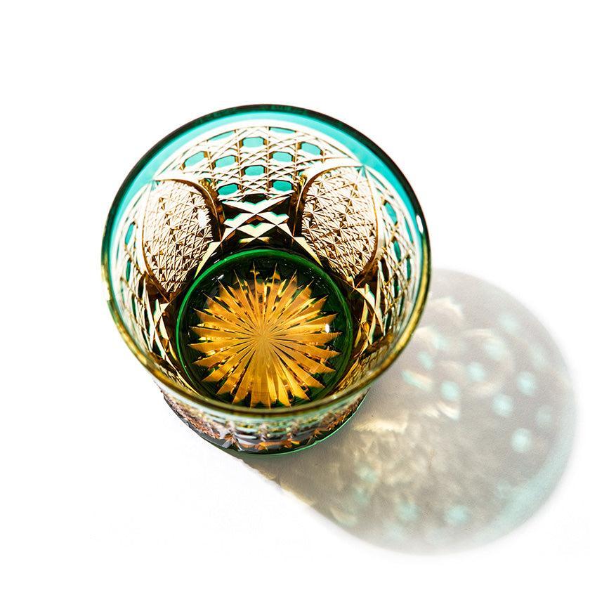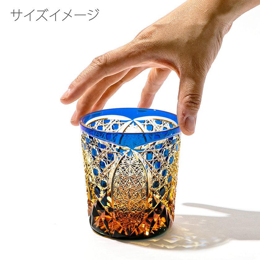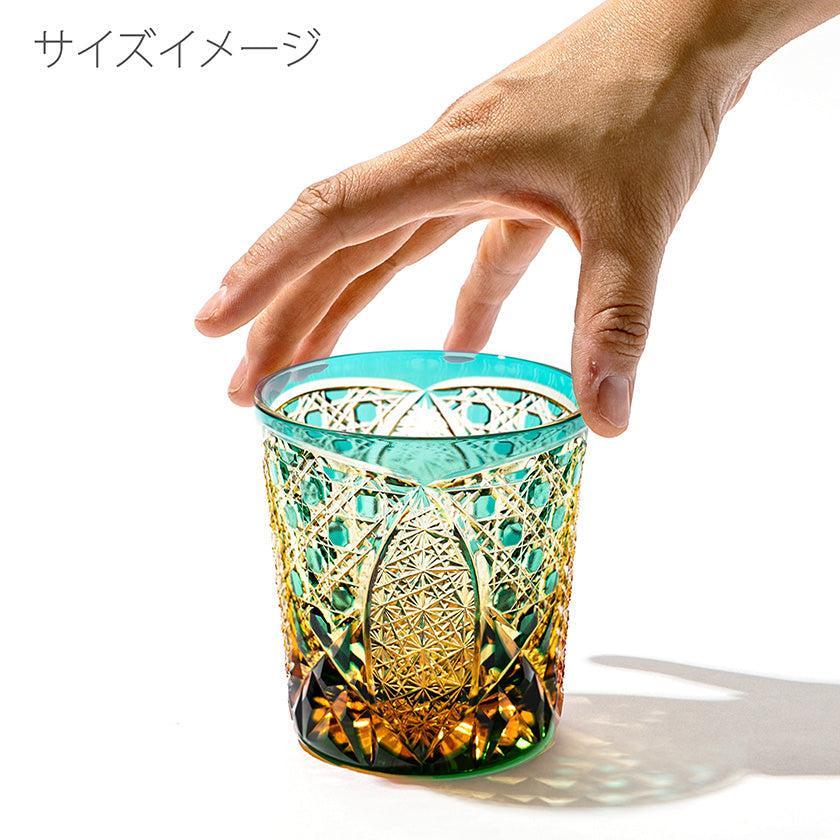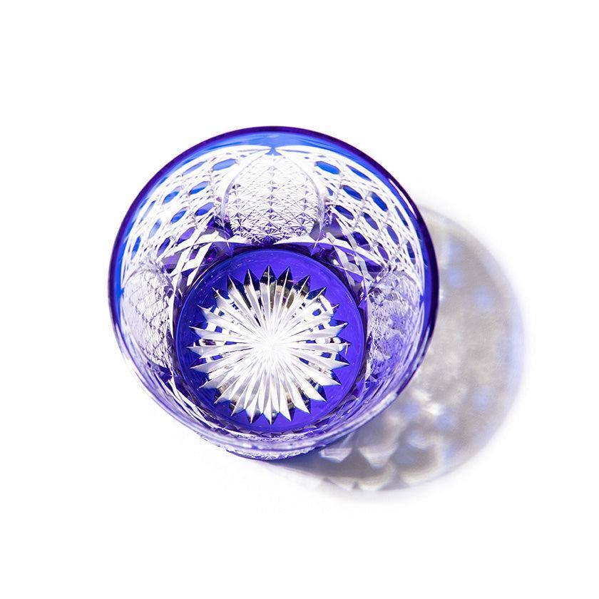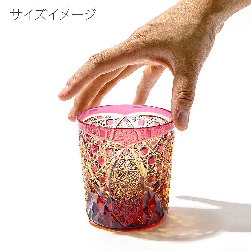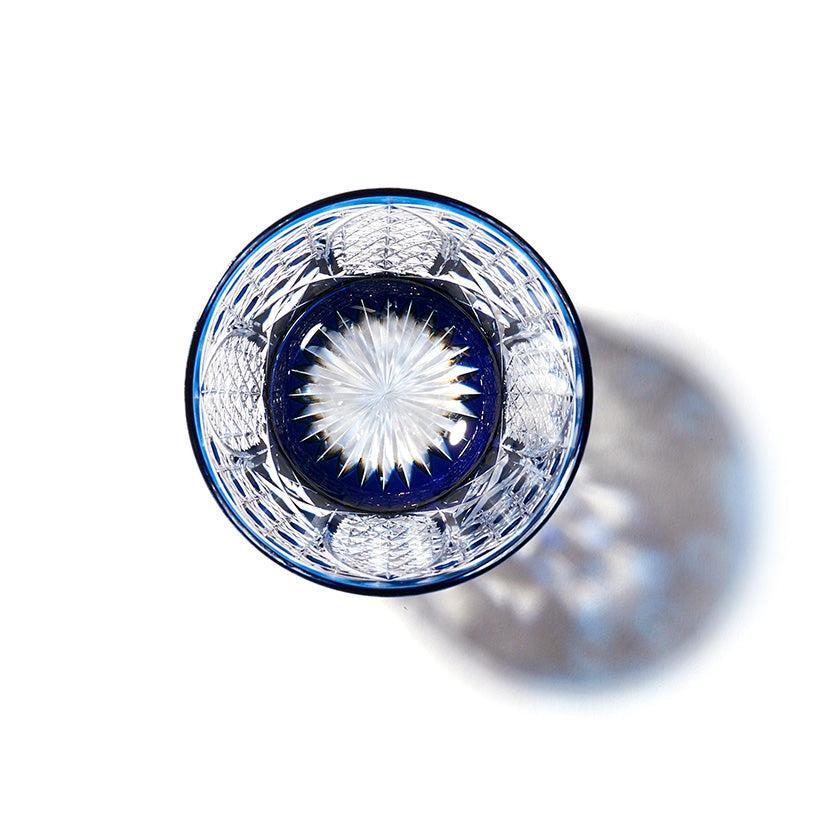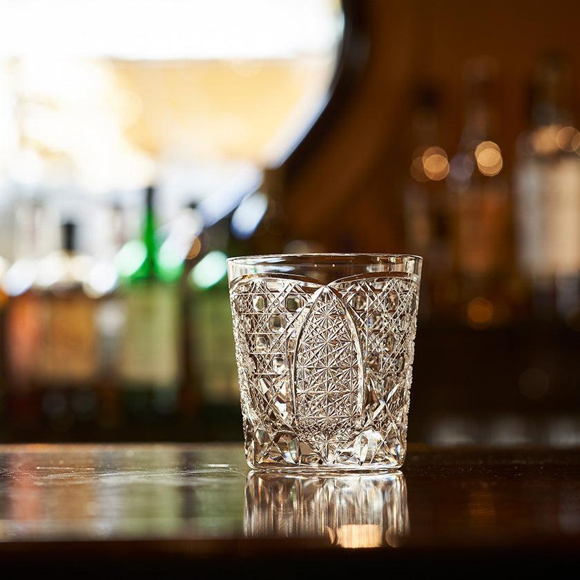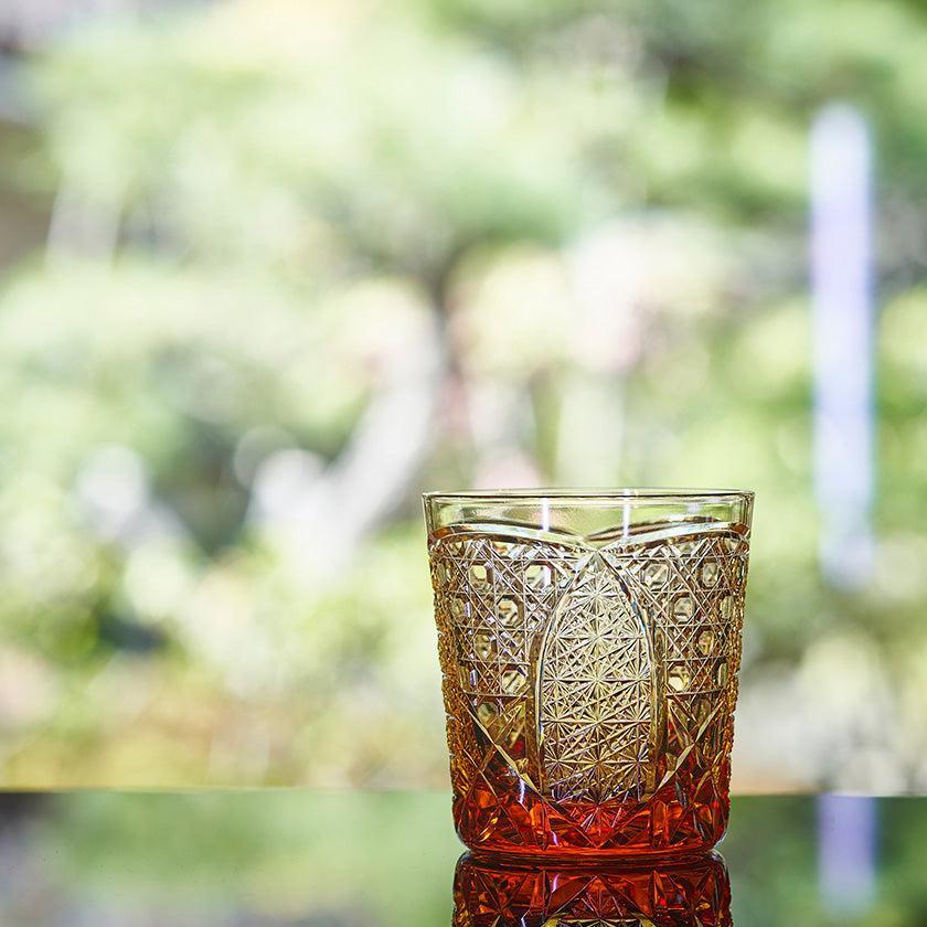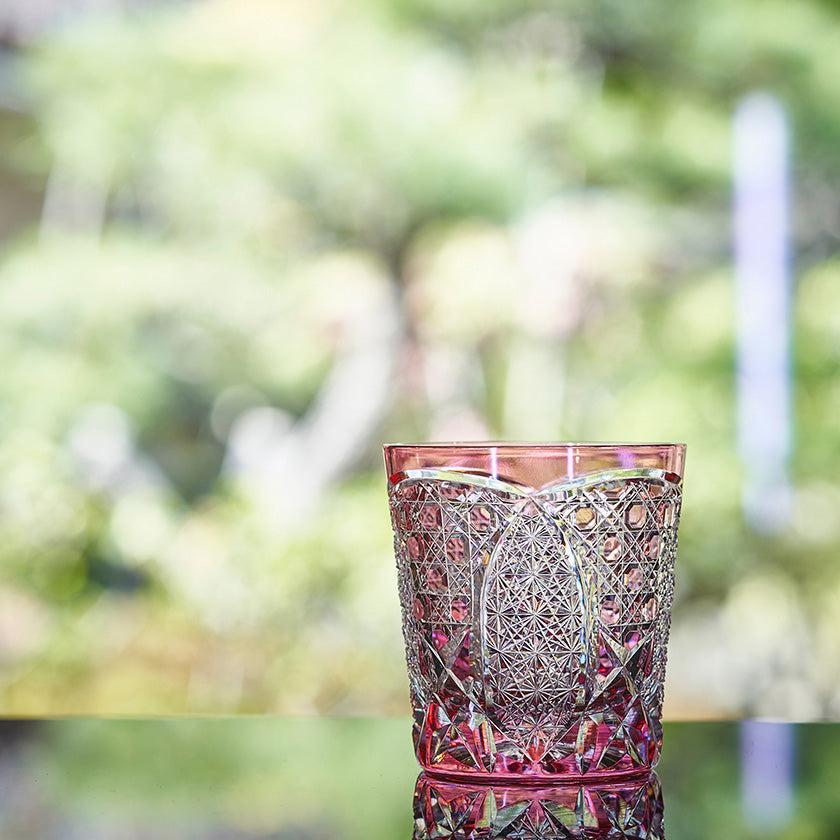 籠の目を図案化し、古来より魔除けとされた「籠目紋」、 不老長寿を表す菊花が連なり咲き誇る様を表す「菊繋ぎ紋」。 二種類の紋様を交互に配した縁起の良い江戸切子です。
