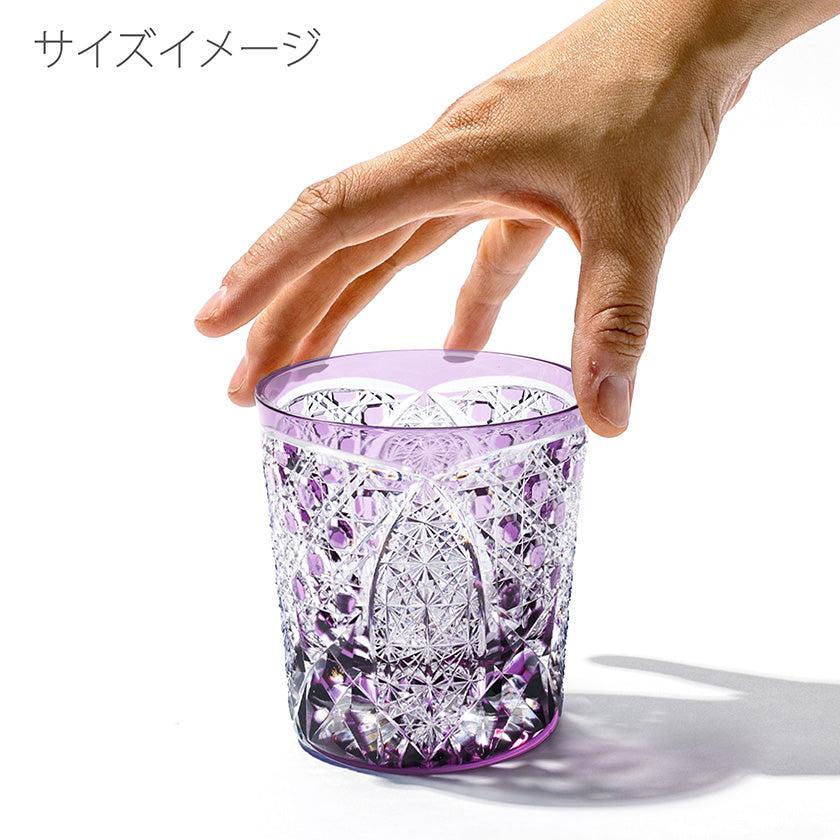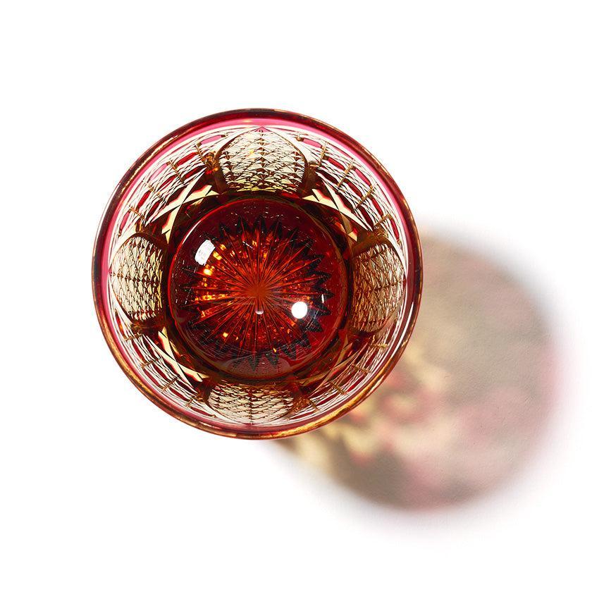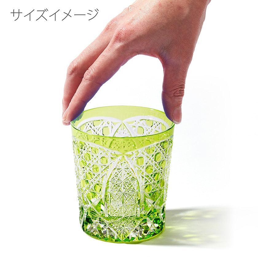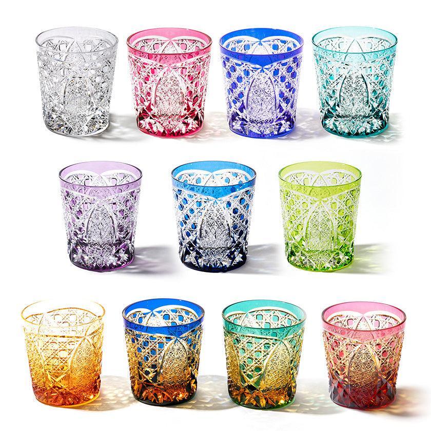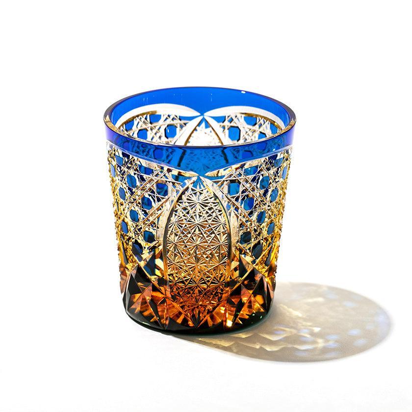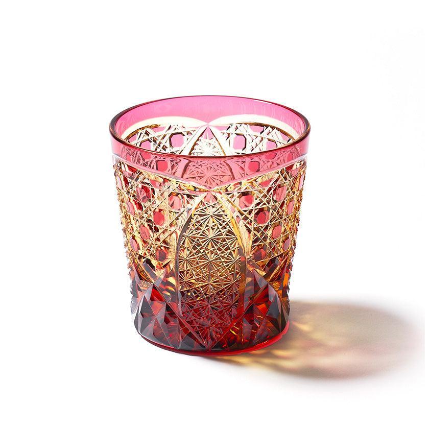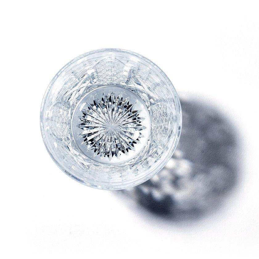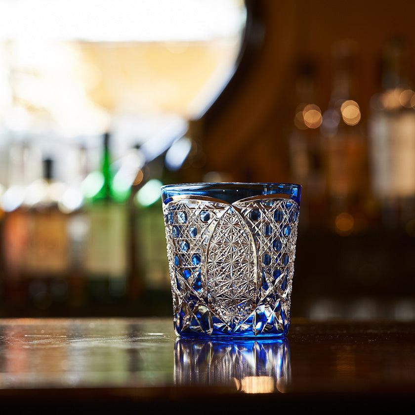 籠の目を図案化し、古来より魔除けとされた「籠目紋」、 不老長寿を表す菊花が連なり咲き誇る様を表す「菊繋ぎ紋」。 二種類の紋様を交互に配した縁起の良い江戸切子です。