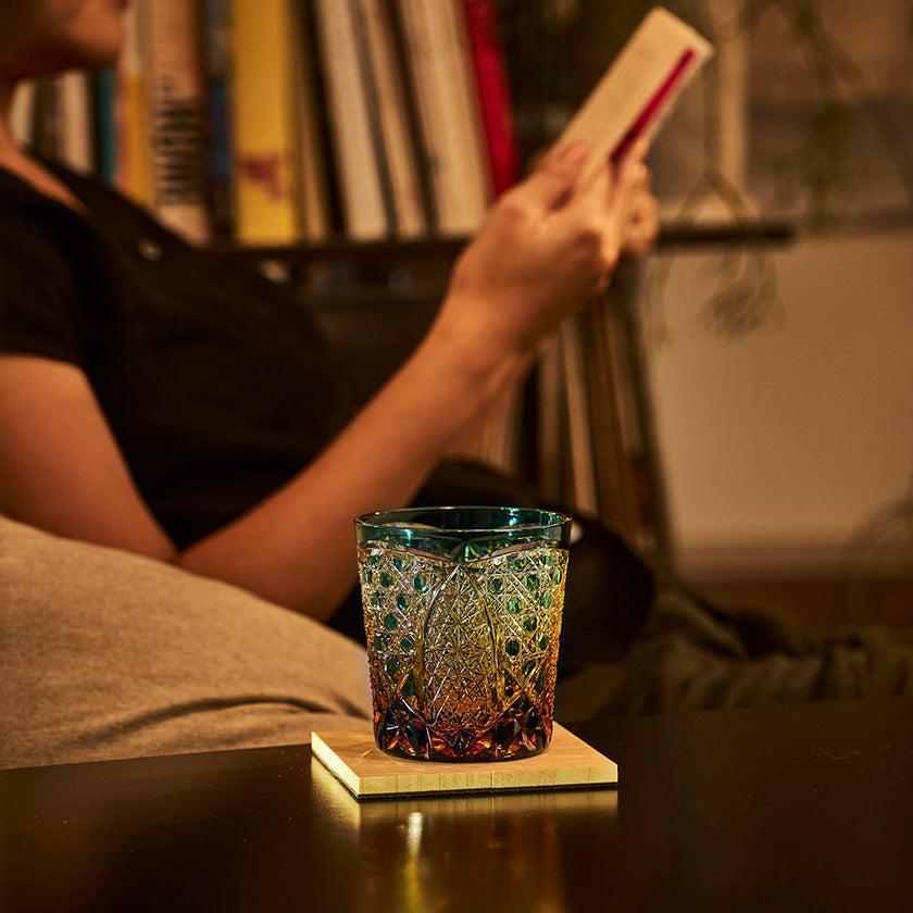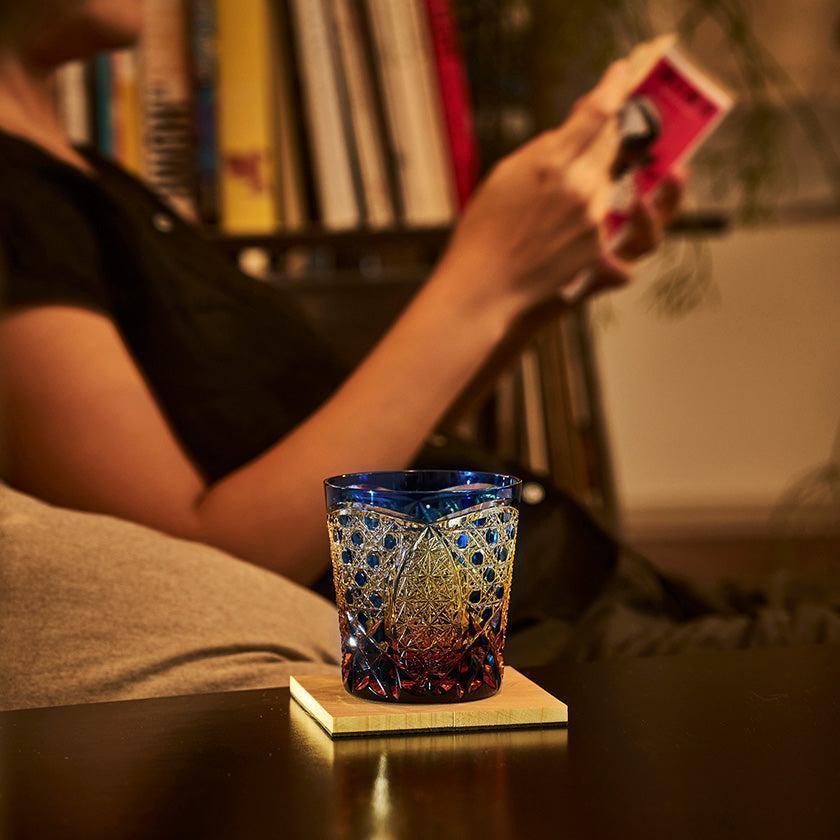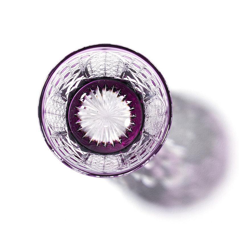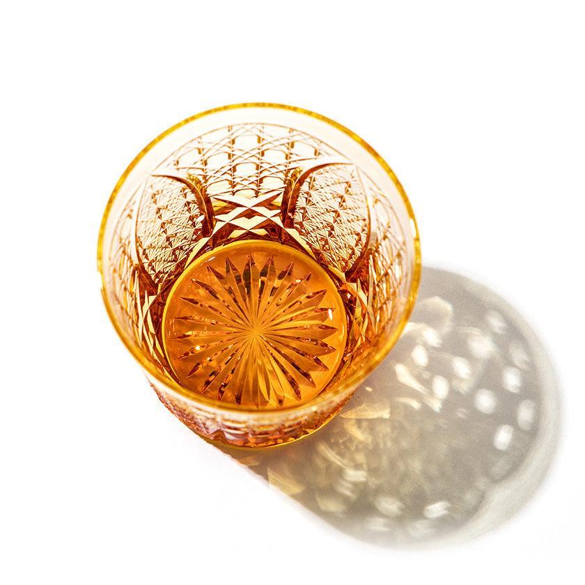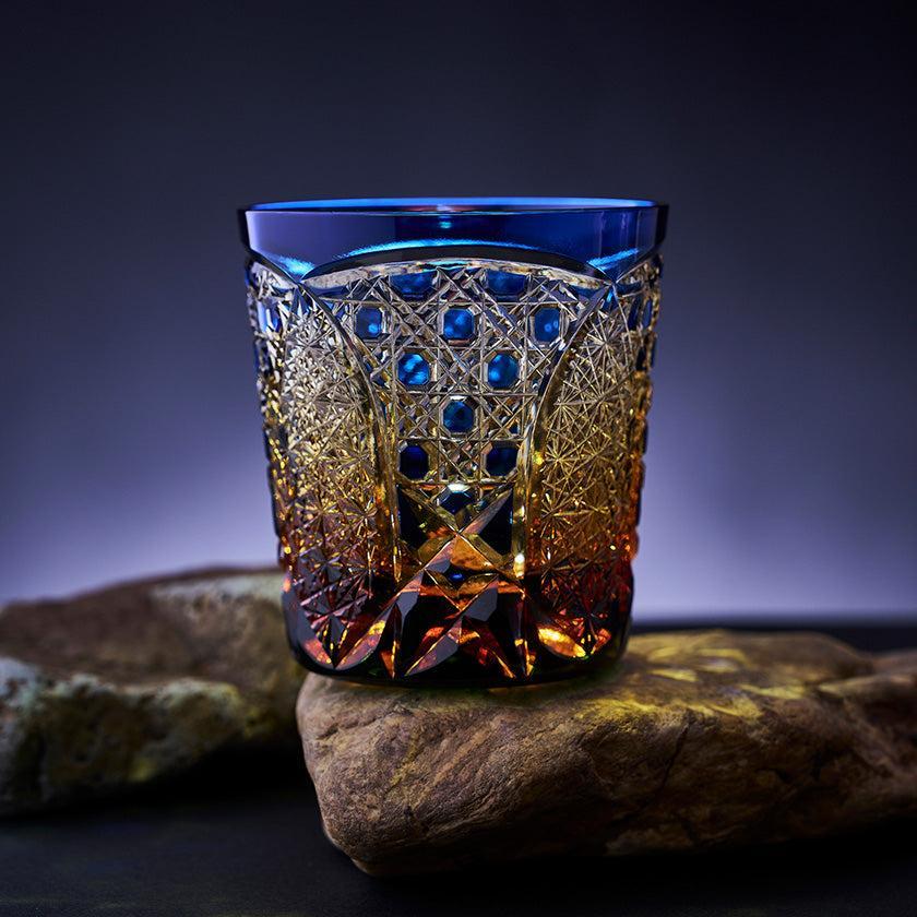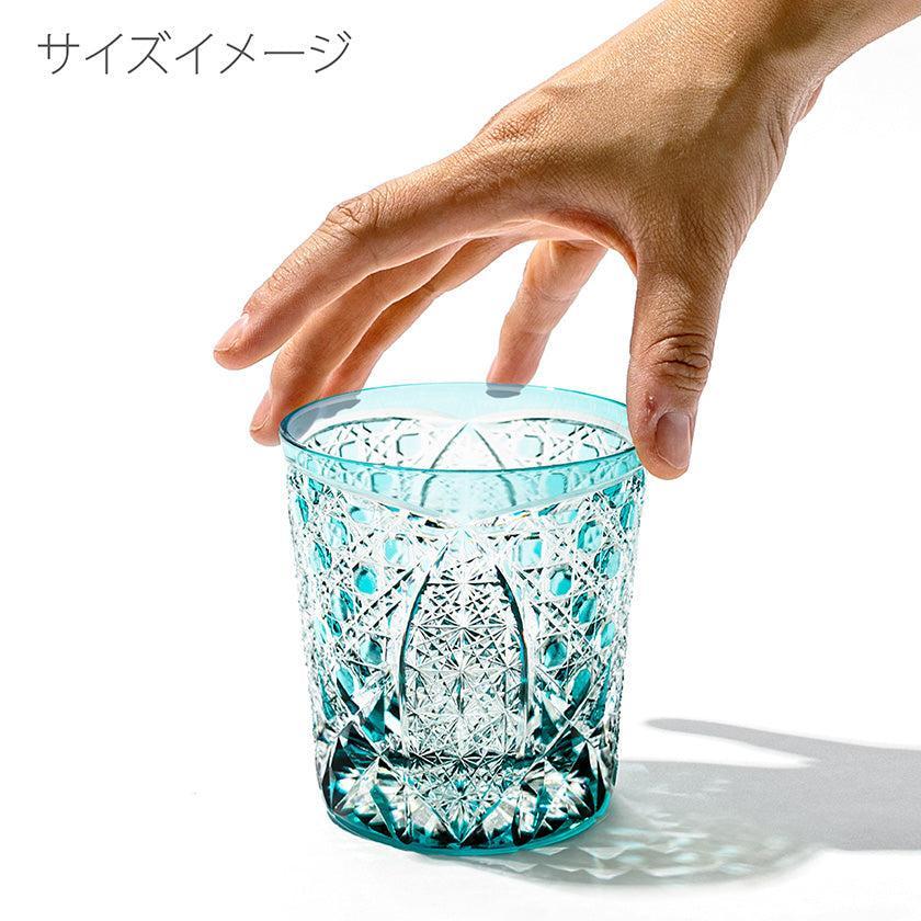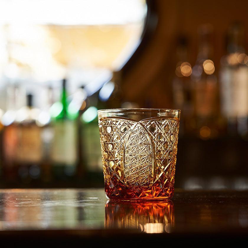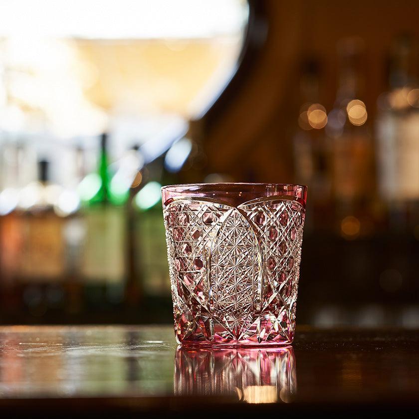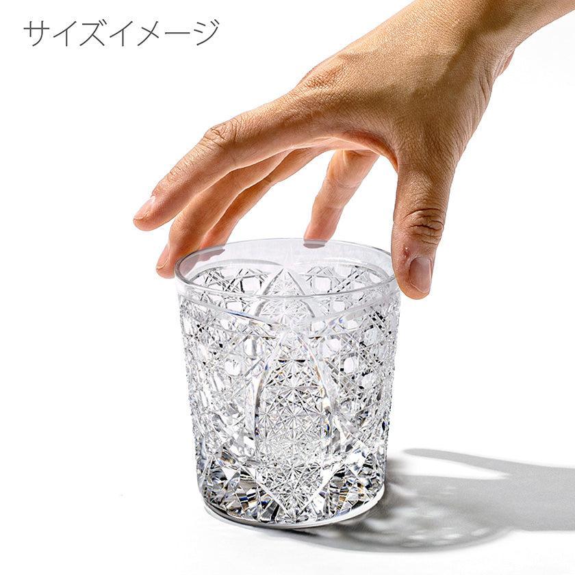 籠の目を図案化し、古来より魔除けとされた「籠目紋」、 不老長寿を表す菊花が連なり咲き誇る様を表す「菊繋ぎ紋」。 二種類の紋様を交互に配した縁起の良い江戸切子です。