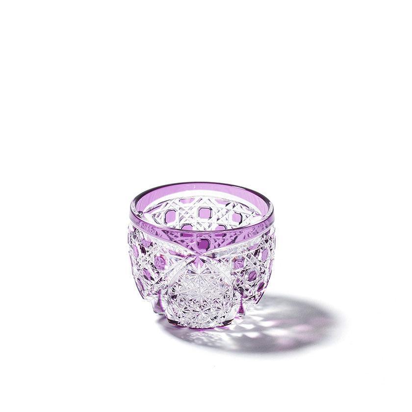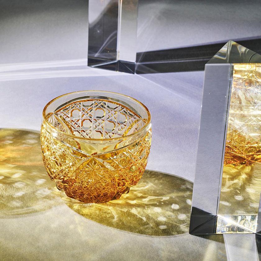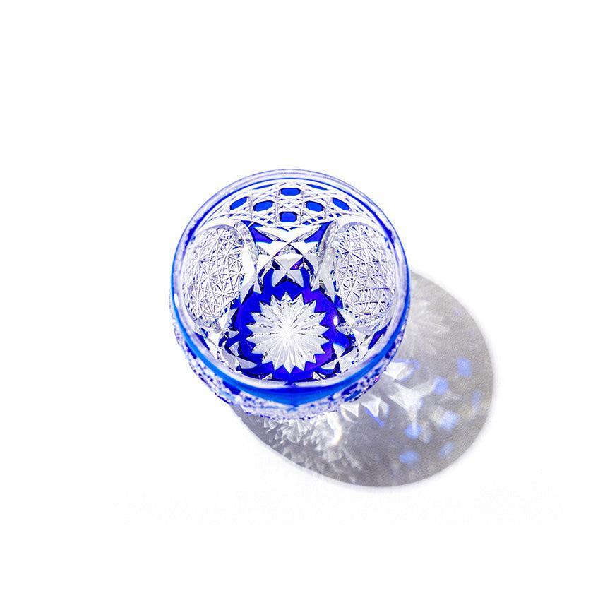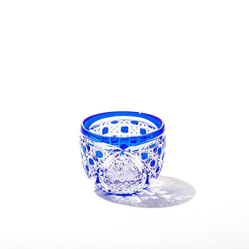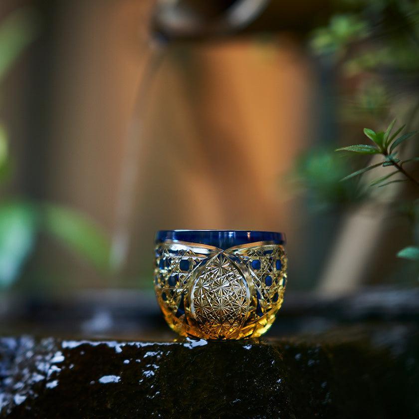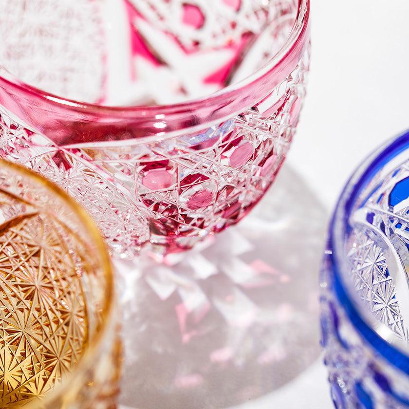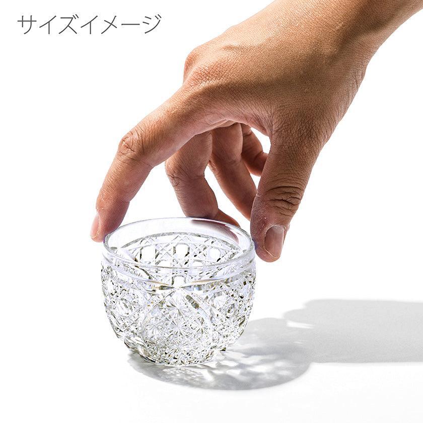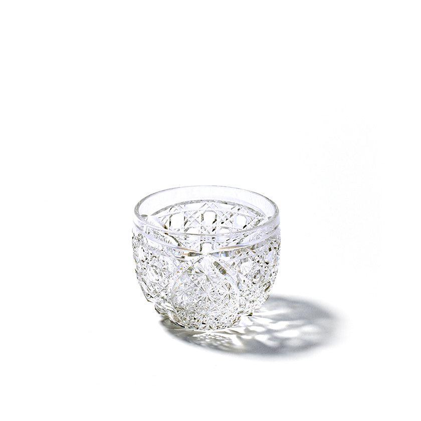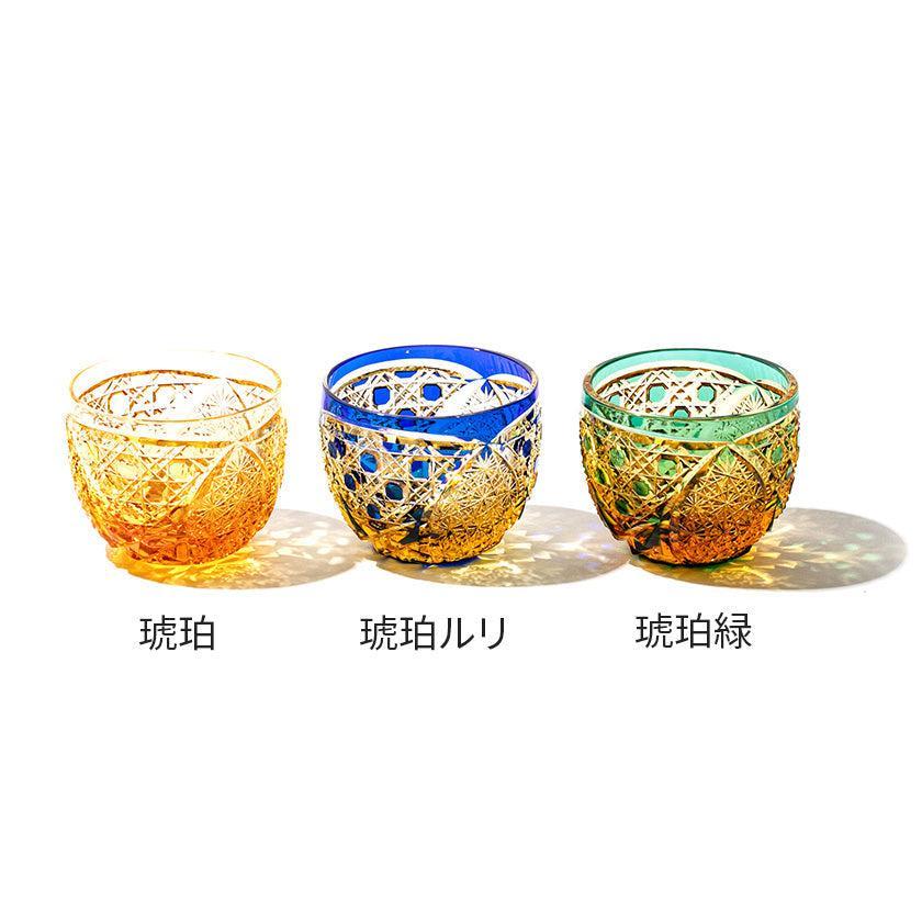 籠の目を図案化し、古来より魔除けとされた「籠目紋」、 不老長寿を表す菊花が連なり咲き誇る様を表す「菊繋ぎ紋」。 二種類の紋様を交互に配した縁起の良い江戸切子です。