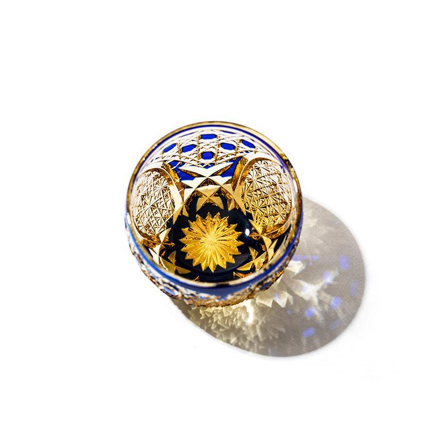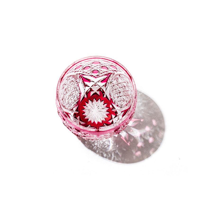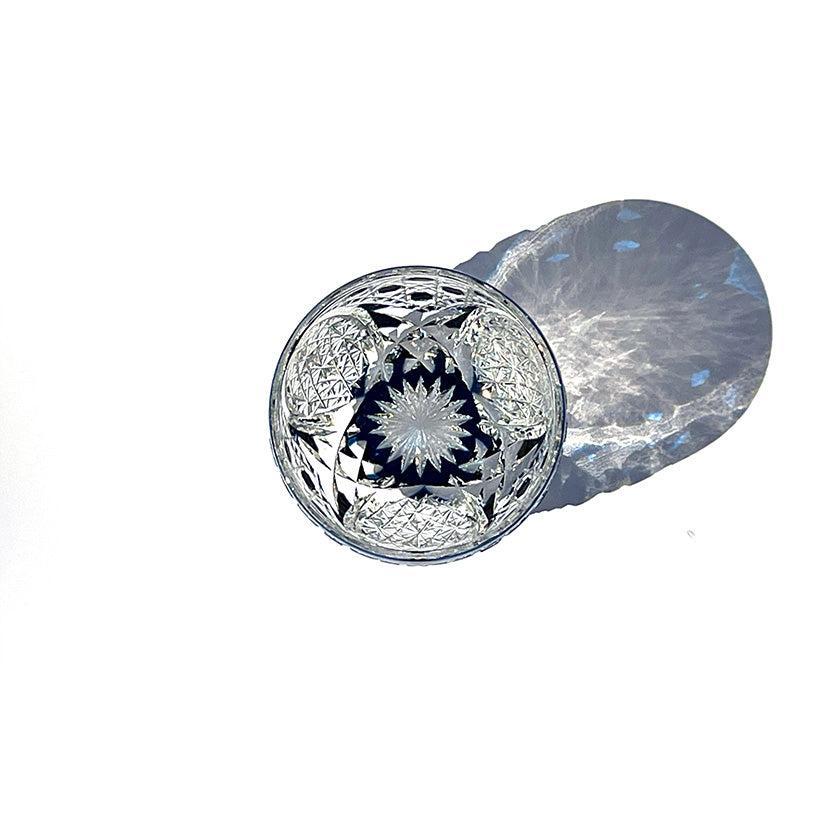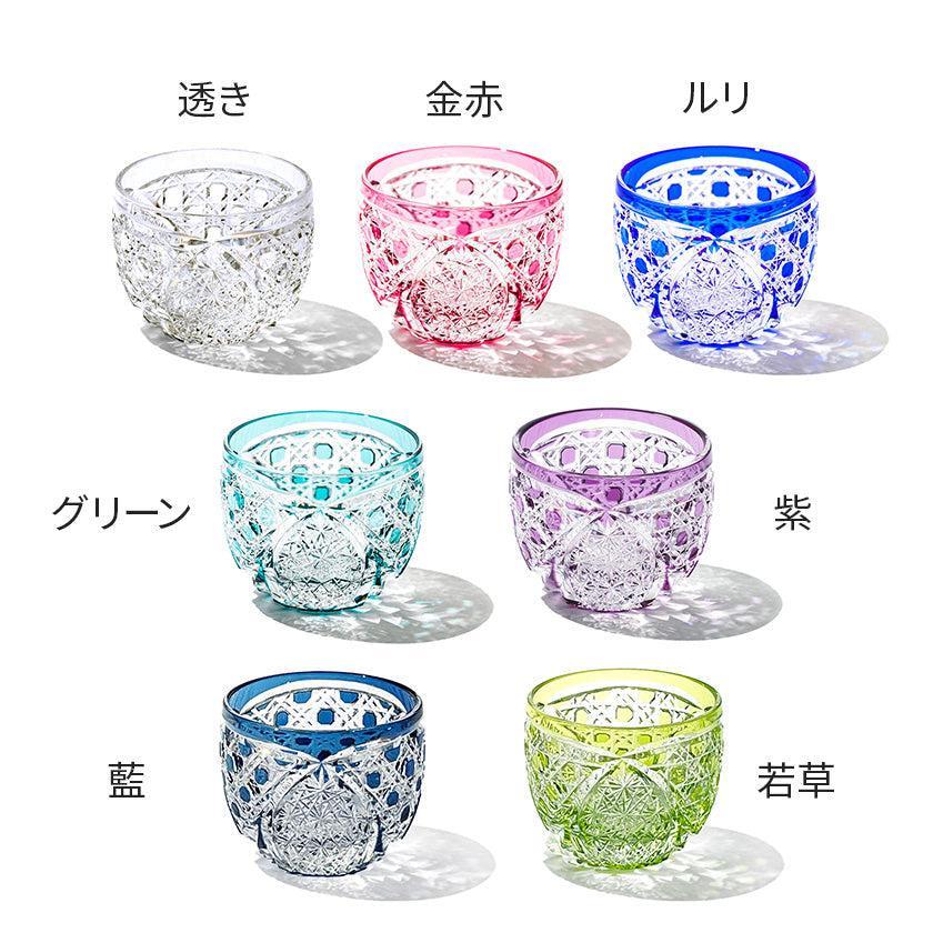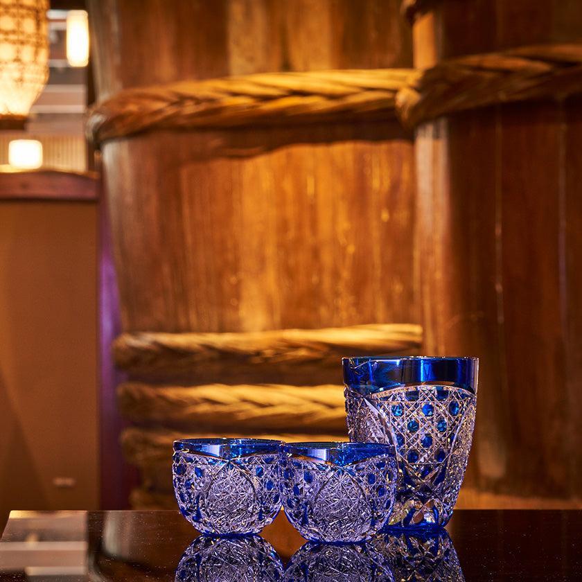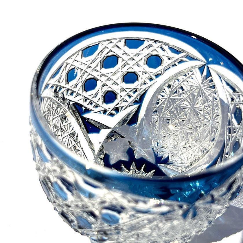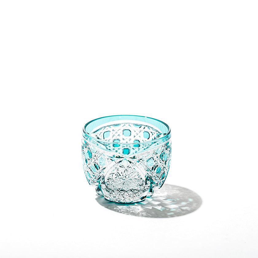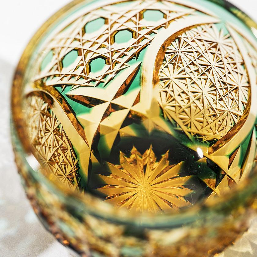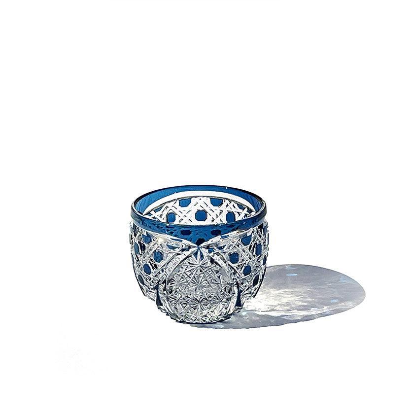 籠の目を図案化し、古来より魔除けとされた「籠目紋」、 不老長寿を表す菊花が連なり咲き誇る様を表す「菊繋ぎ紋」。 二種類の紋様を交互に配した縁起の良い江戸切子です。