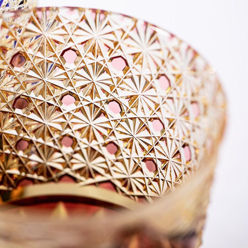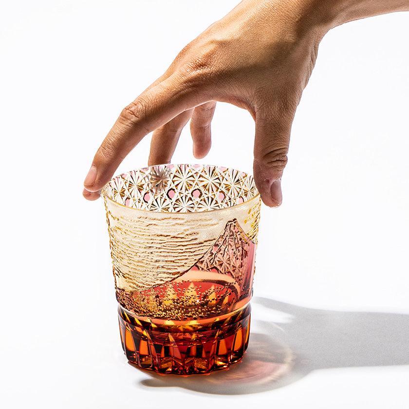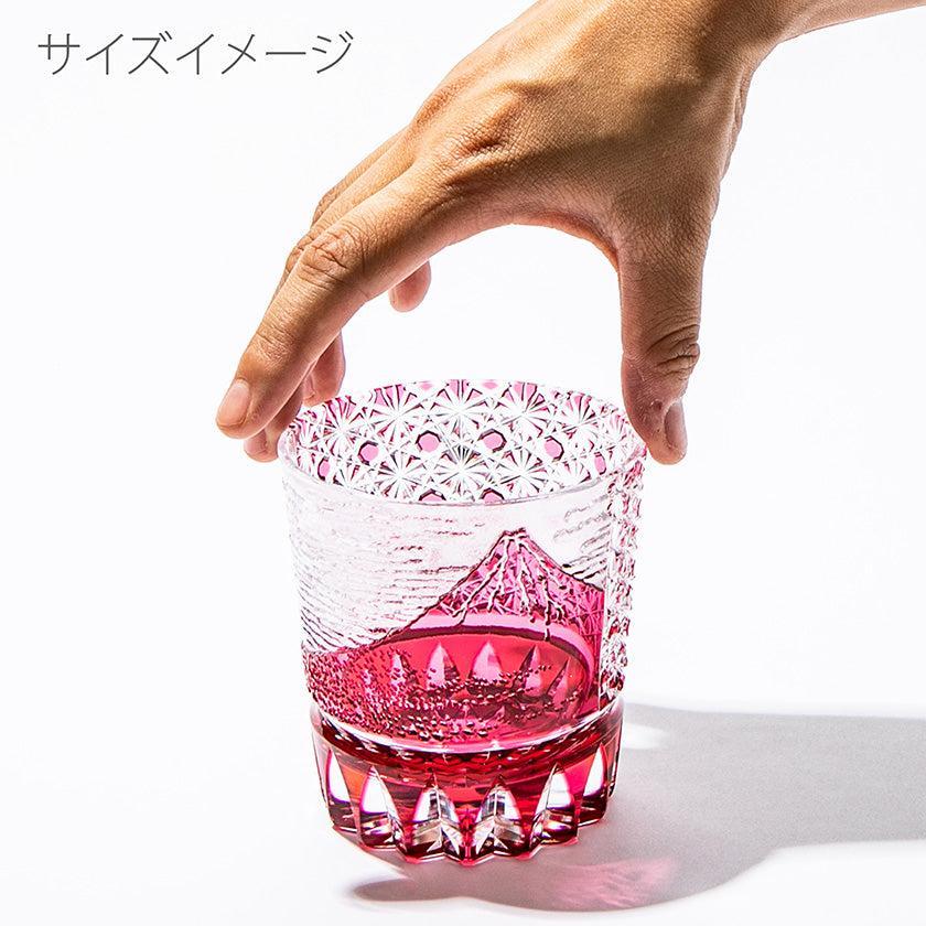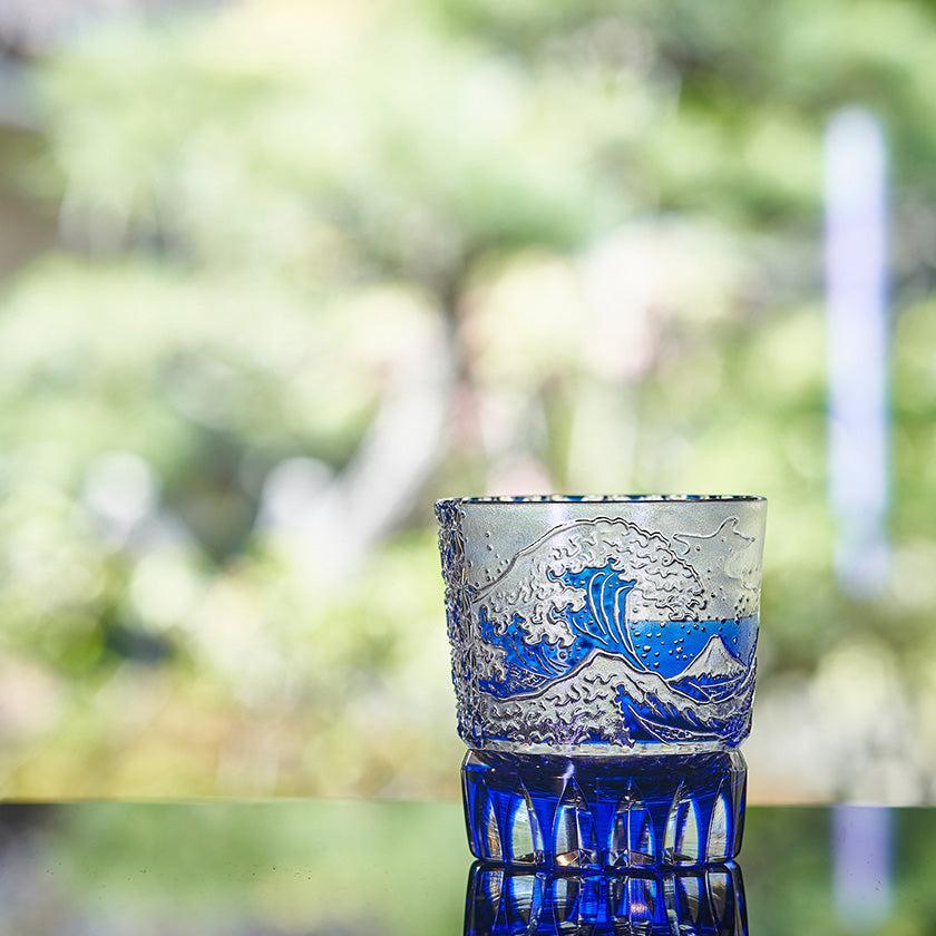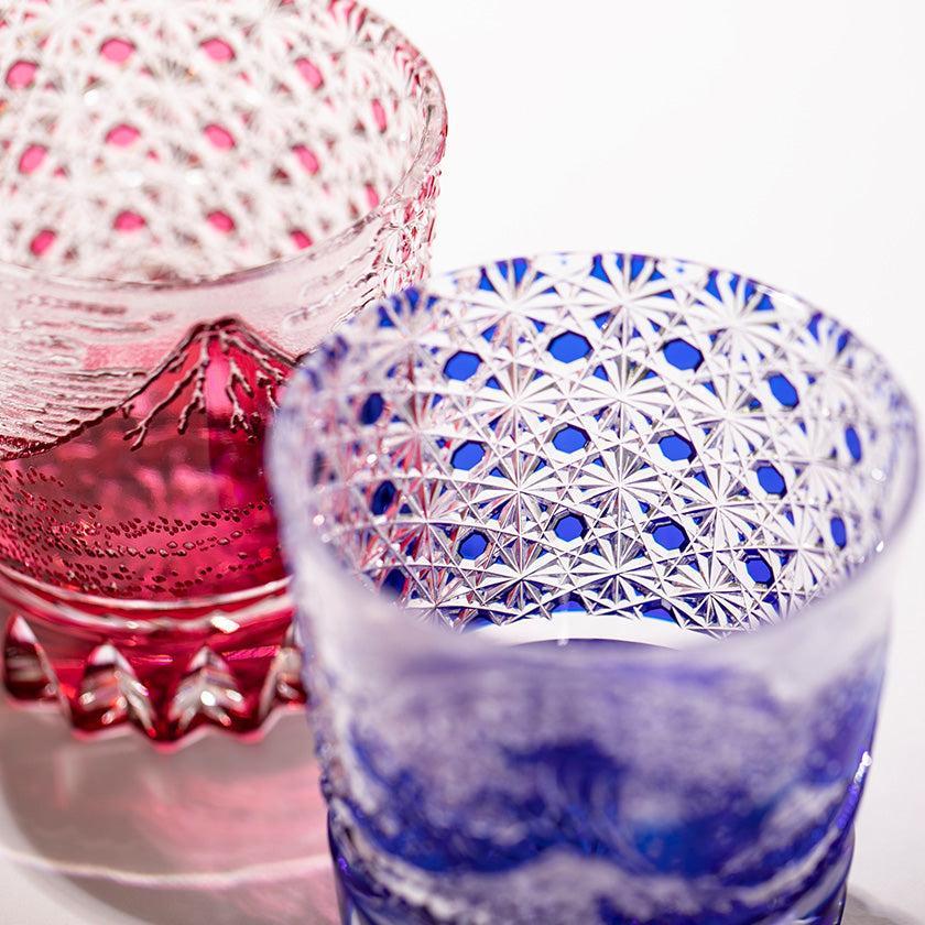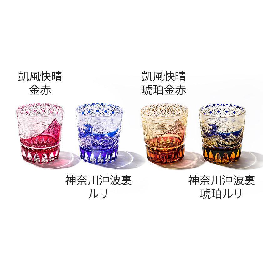 葛飾北斎による富嶽三十六景の代表作「凱風快晴」「神奈川沖波裏」をモチーフに、江戸切子の代表的な紋様「菊籠目」を施した 大変縁起の良いこだわりの逸品です。