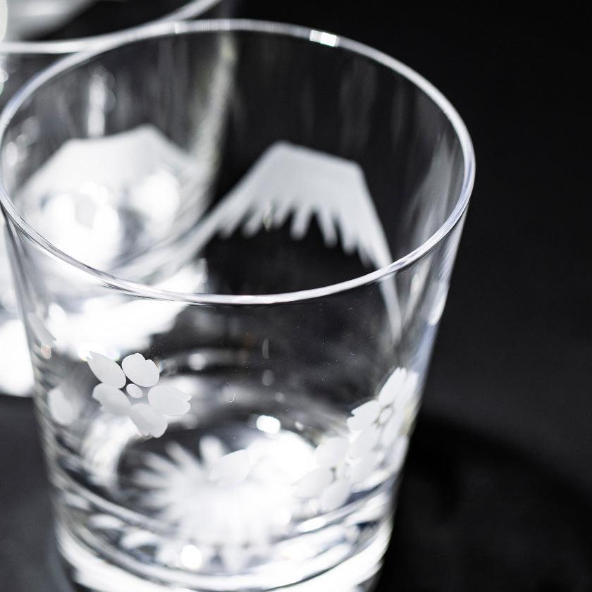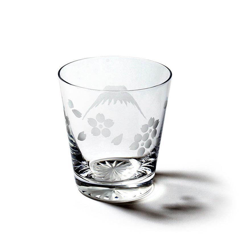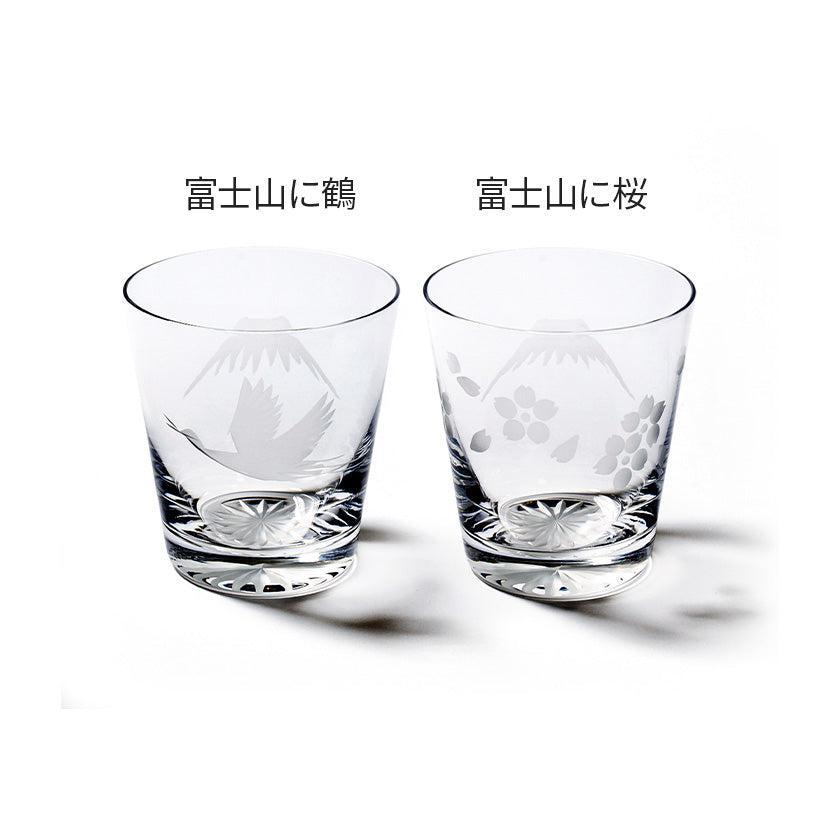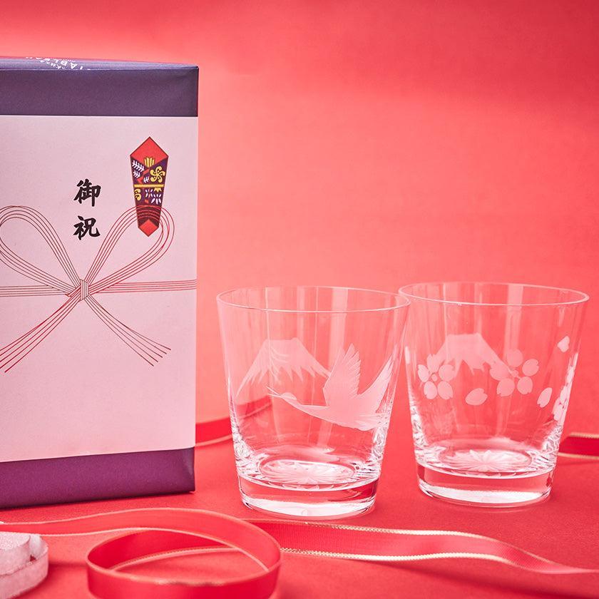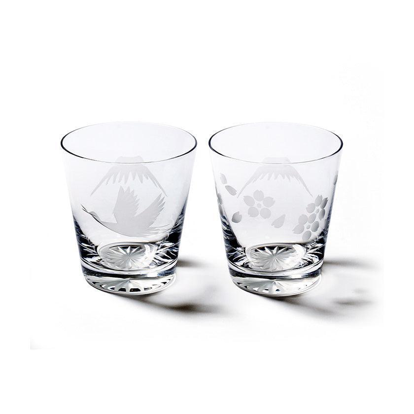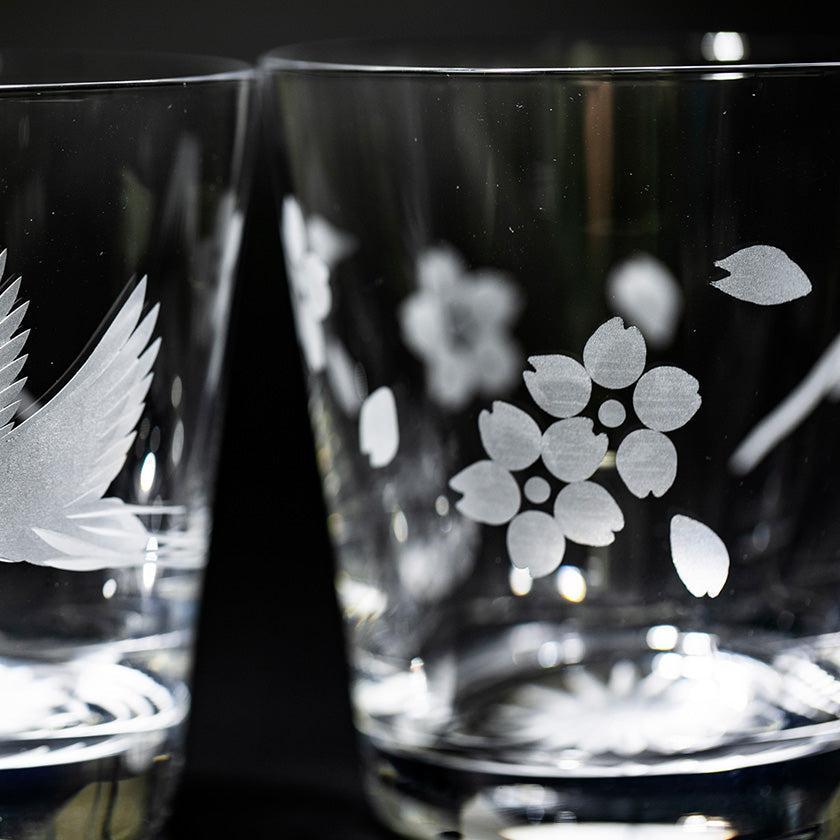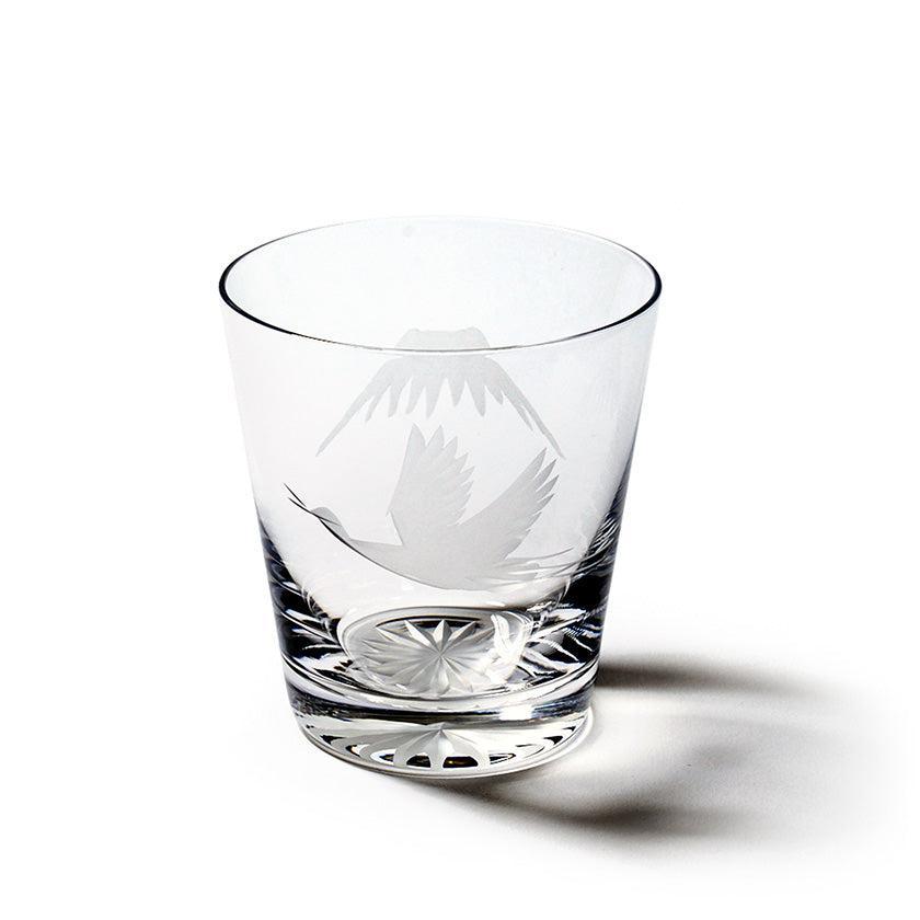 透明のガラスに花切子の技法で縁起の良い富士と鶴・桜をカットしました。日常の様々なシーンに溶け込み、「使いたくなる」シリーズです。