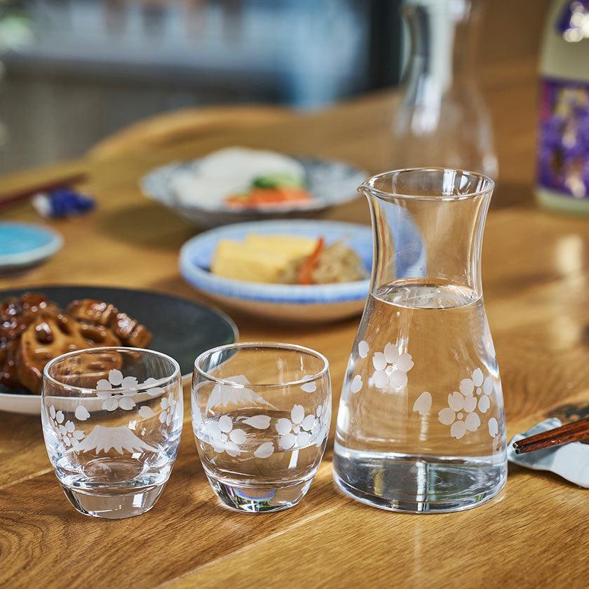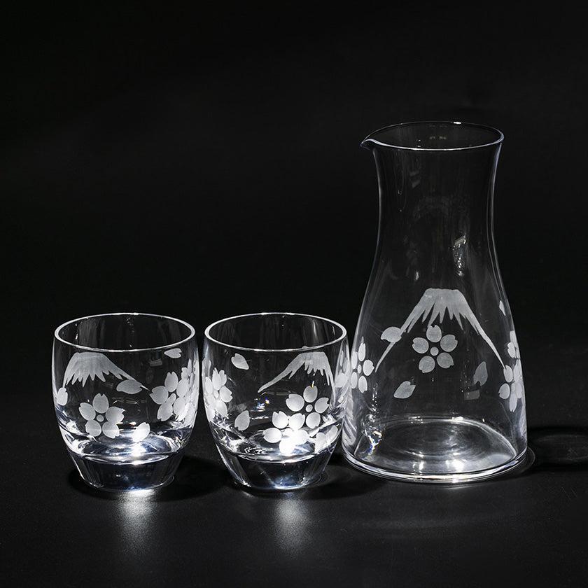透明のガラスに花切子の技法で縁起の良い富士と桜をカットしました。日常の様々なシーンに溶け込み、「使いたくなる」シリーズです。