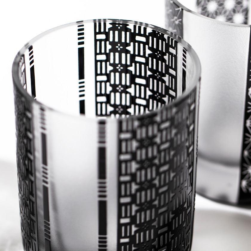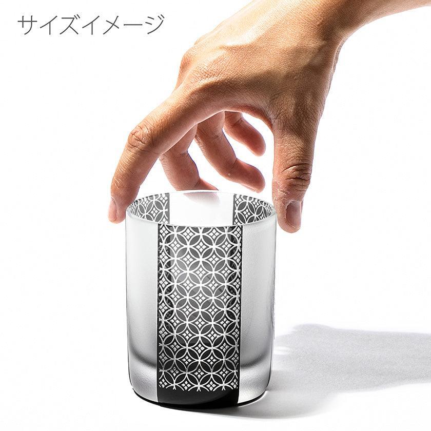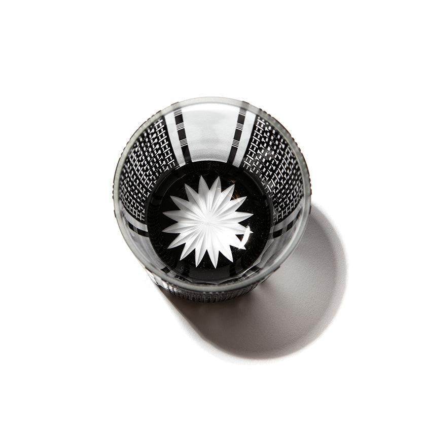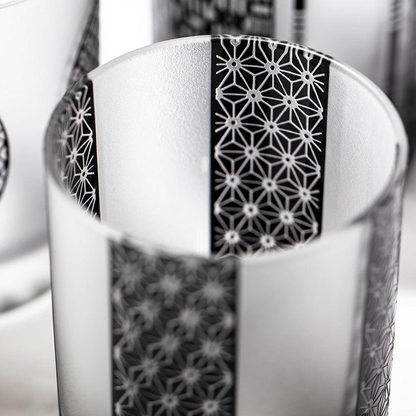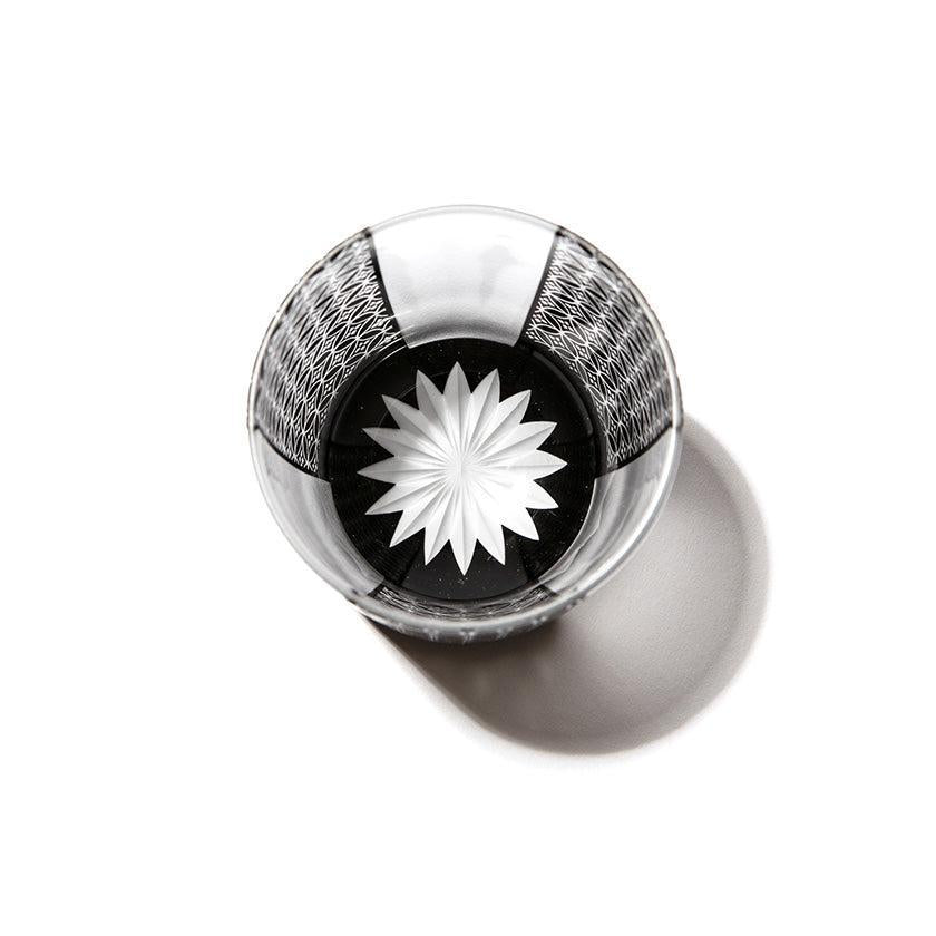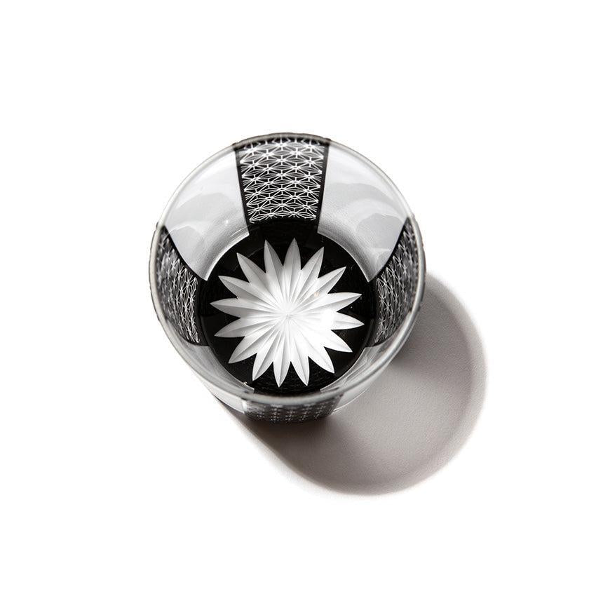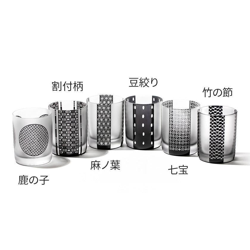 黒小紋は 熟練の職人が手吹きで造り上げた二層構造のガラス器へ 伝統的な江戸小紋「鹿の子」「割付柄」「麻ノ葉」「豆絞り」「七宝」「竹の節」を彫刻した作品です。江戸小紋の粋で繊細な紋様と落ち着いた黒被せガラスの組み合わせが美しいシリーズです。