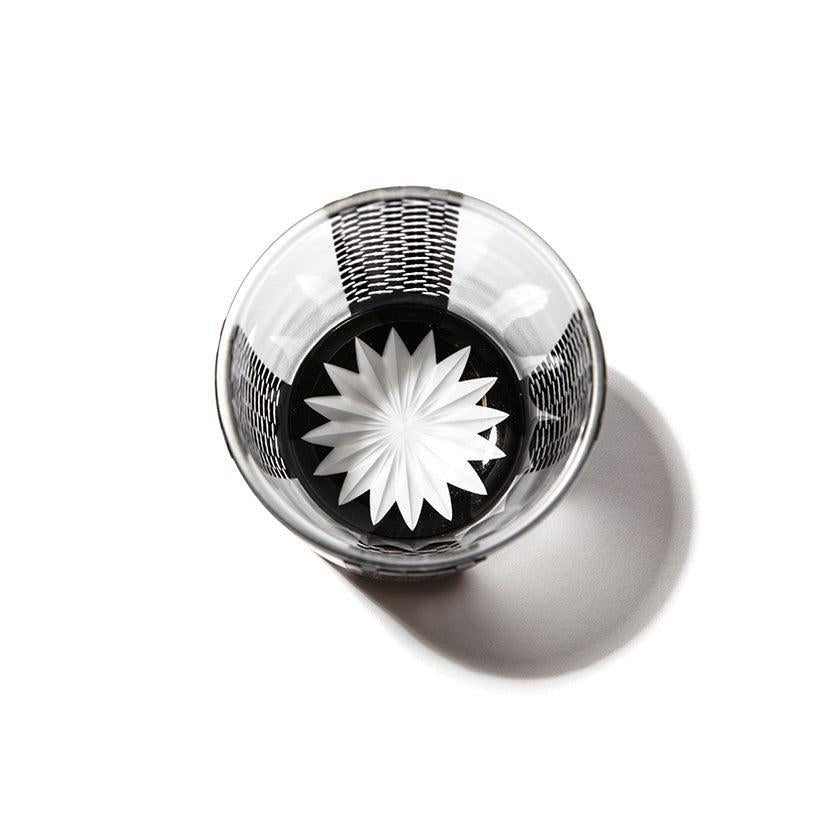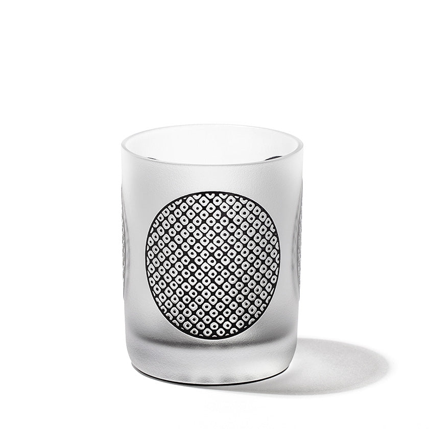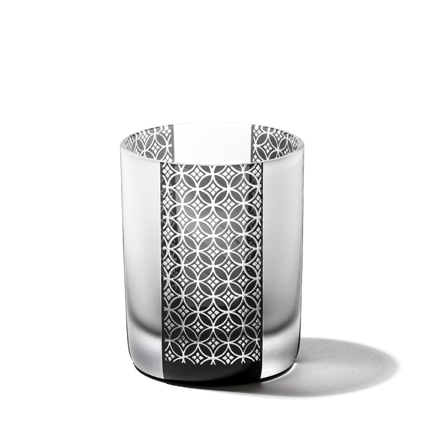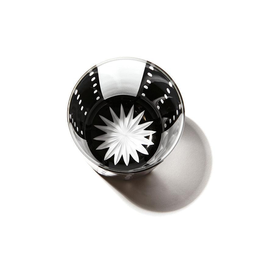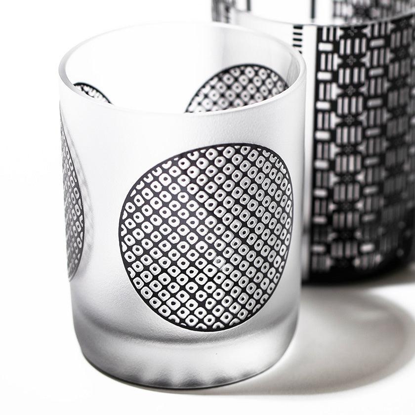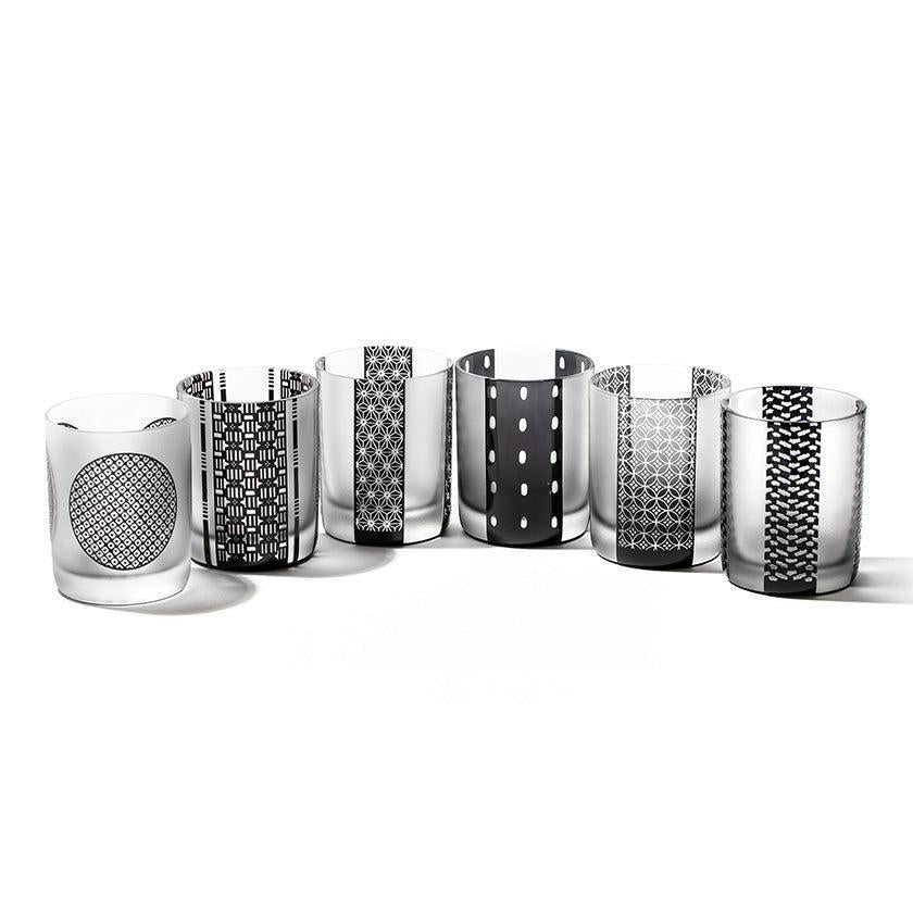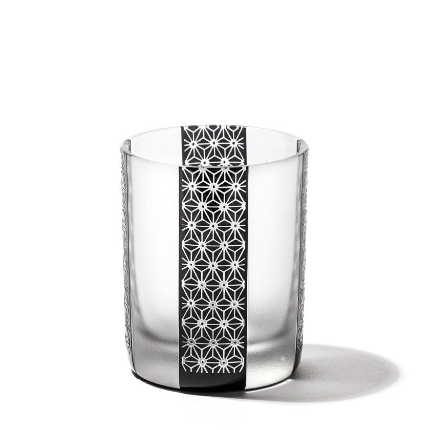 黒小紋は 熟練の職人が手吹きで造り上げた二層構造のガラス器へ 伝統的な江戸小紋「鹿の子」「割付柄」「麻ノ葉」「豆絞り」「七宝」「竹の節」を彫刻した作品です。江戸小紋の粋で繊細な紋様と落ち着いた黒被せガラスの組み合わせが美しいシリーズです。