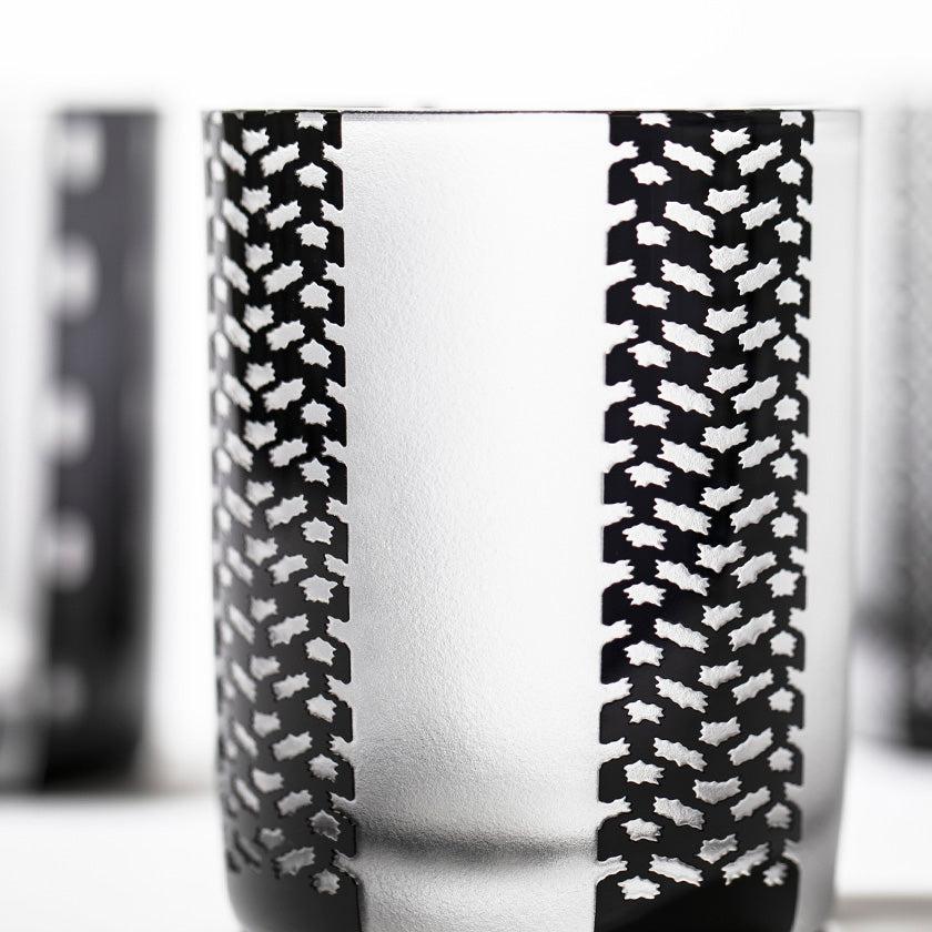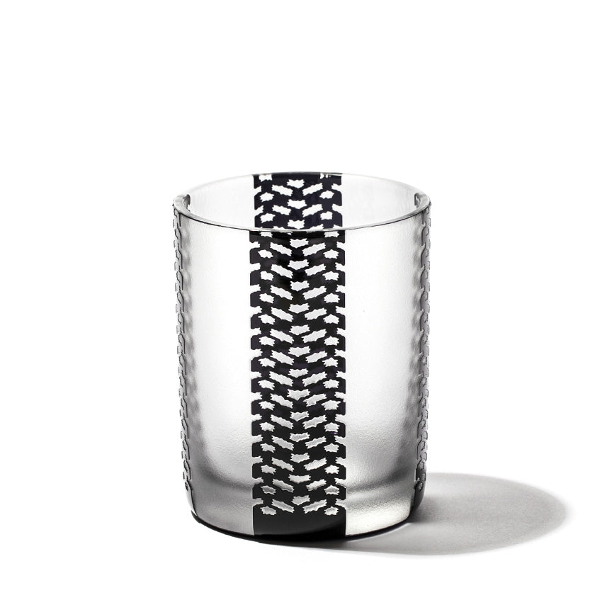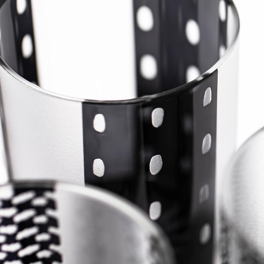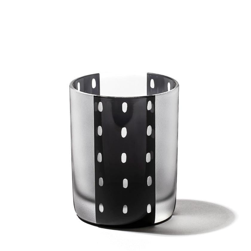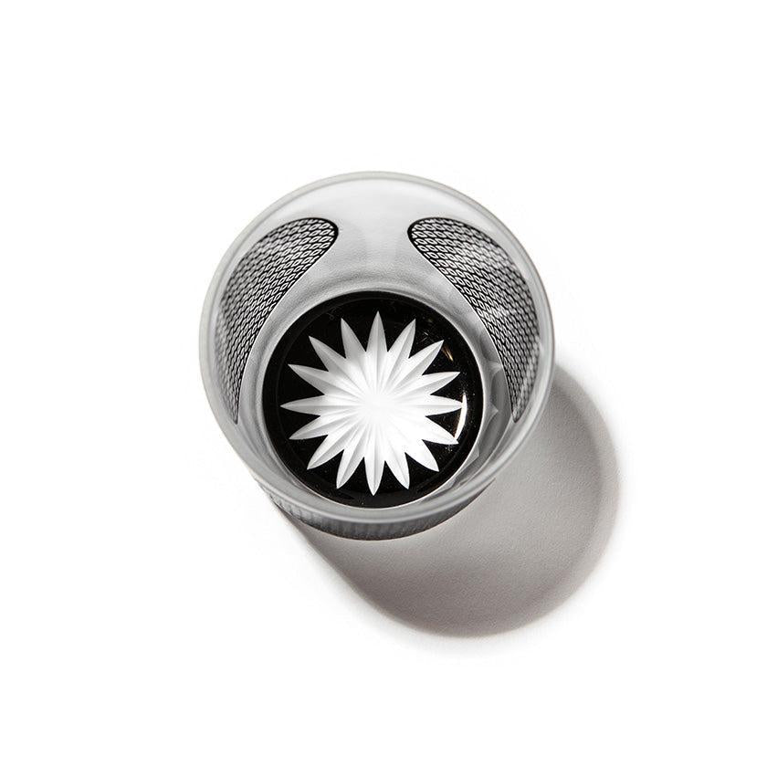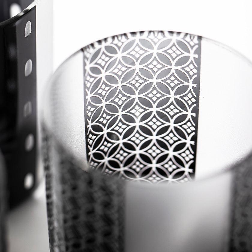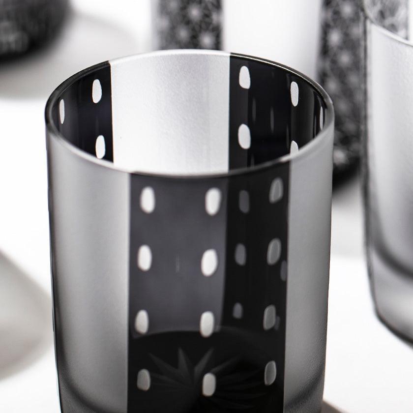 黒小紋は 熟練の職人が手吹きで造り上げた二層構造のガラス器へ 伝統的な江戸小紋「鹿の子」「割付柄」「麻ノ葉」「豆絞り」「七宝」「竹の節」を彫刻した作品です。江戸小紋の粋で繊細な紋様と落ち着いた黒被せガラスの組み合わせが美しいシリーズです。