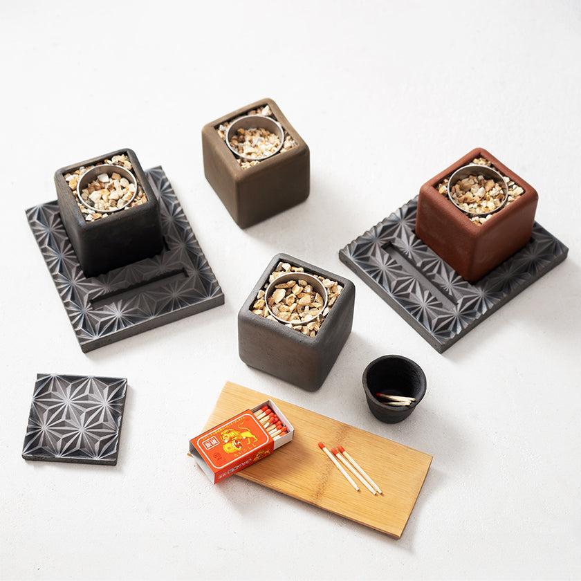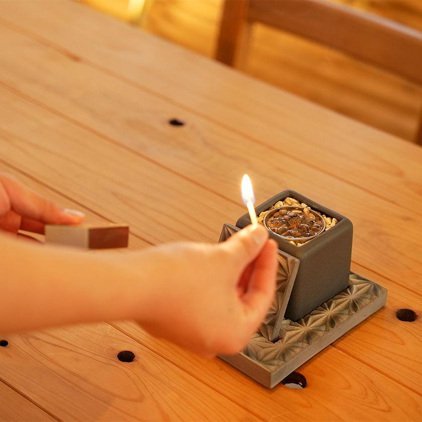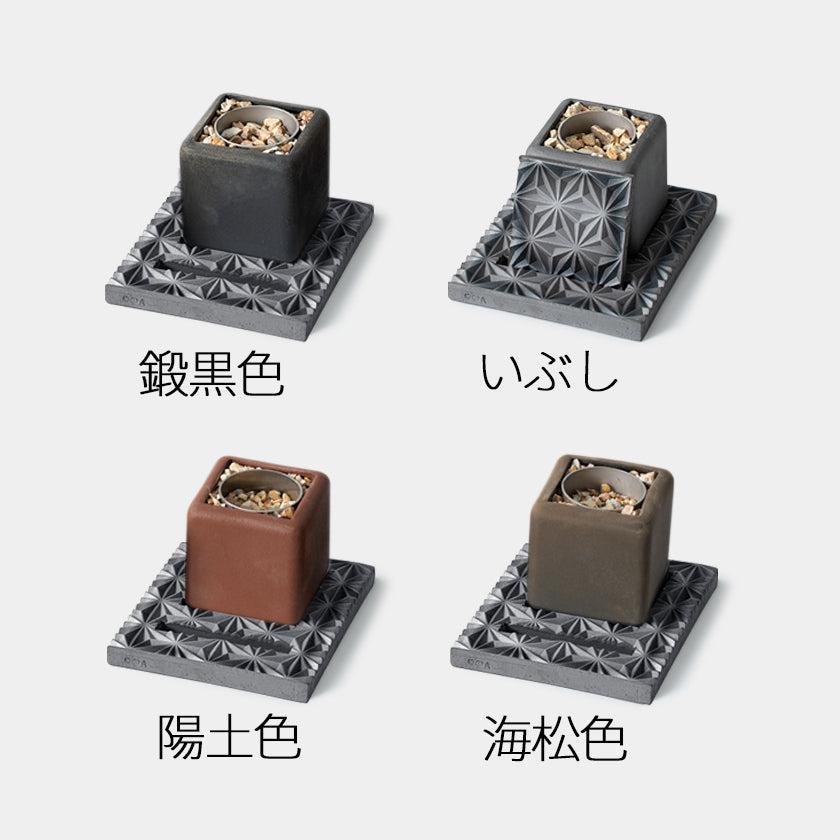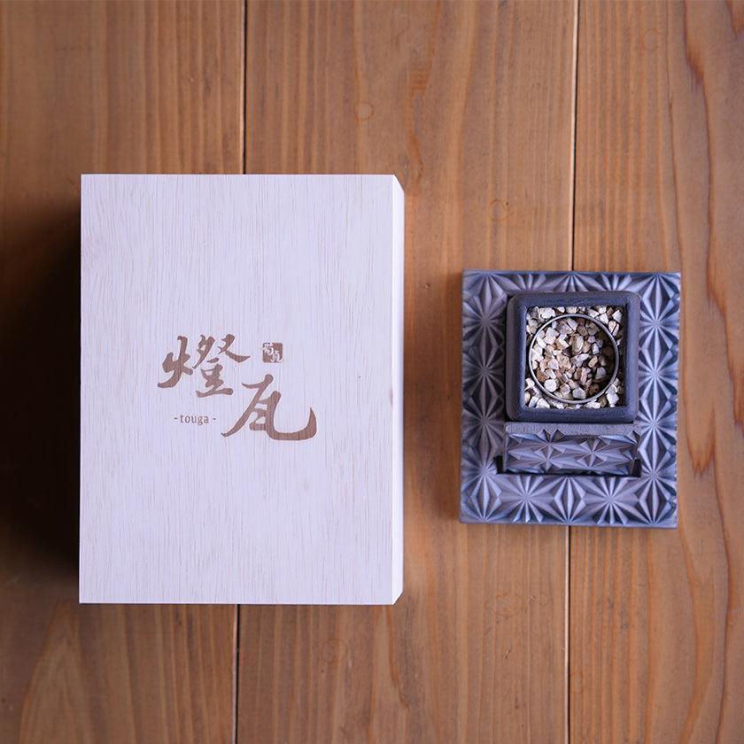 | サイズ (cm) | 本体: W7.2 * D7.2、土台: W13 * D15、火消し蓋: W7.5 * D7.5 木箱: W18.2 * D23.2 * H9.6 |
