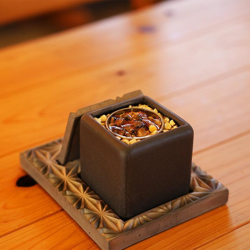 | 素材 | 本体: 瓦、金属カップ、伊予陶石 木箱: ファルカタ |